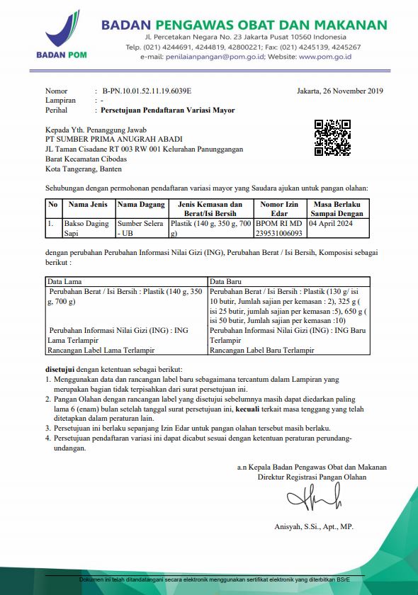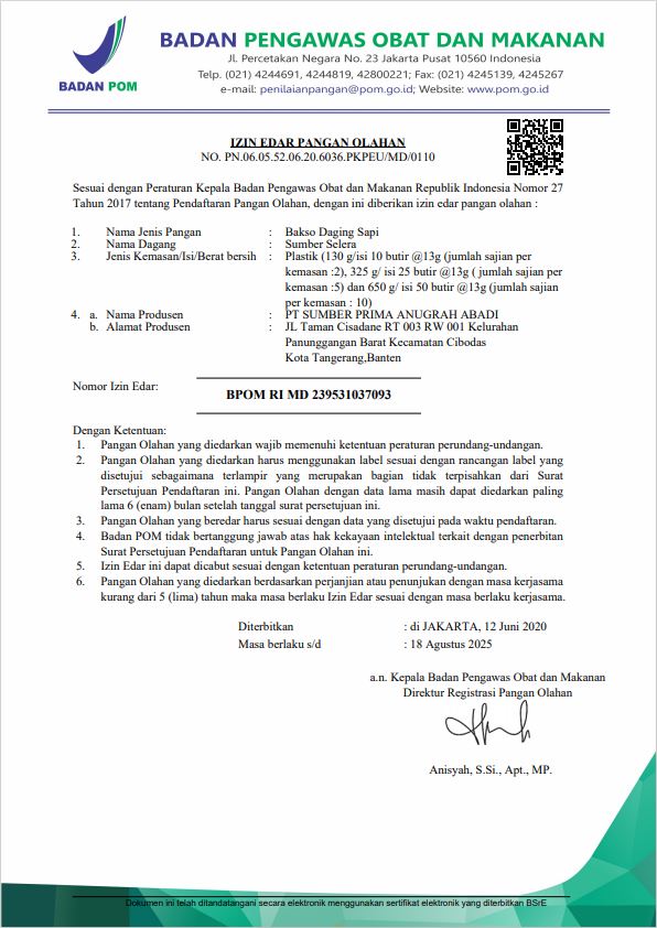 Produk Sumber Selera sudah lulus uji Badan Pengawas Obat dan Makanan (BPOM) dan Produk bersertifikat halal MUI, maka disimpulkan bahwa Produk Sumber Selera 100% aman untuk dikonsumsi oleh masyarakat Indonesia.